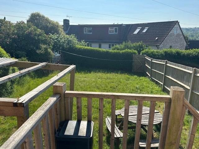 Large decked balcony with Downs views, bike shed, gardens, driveway